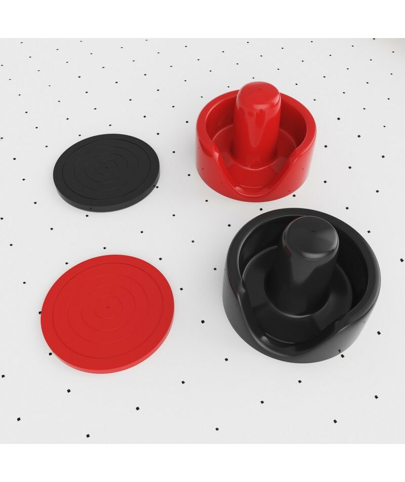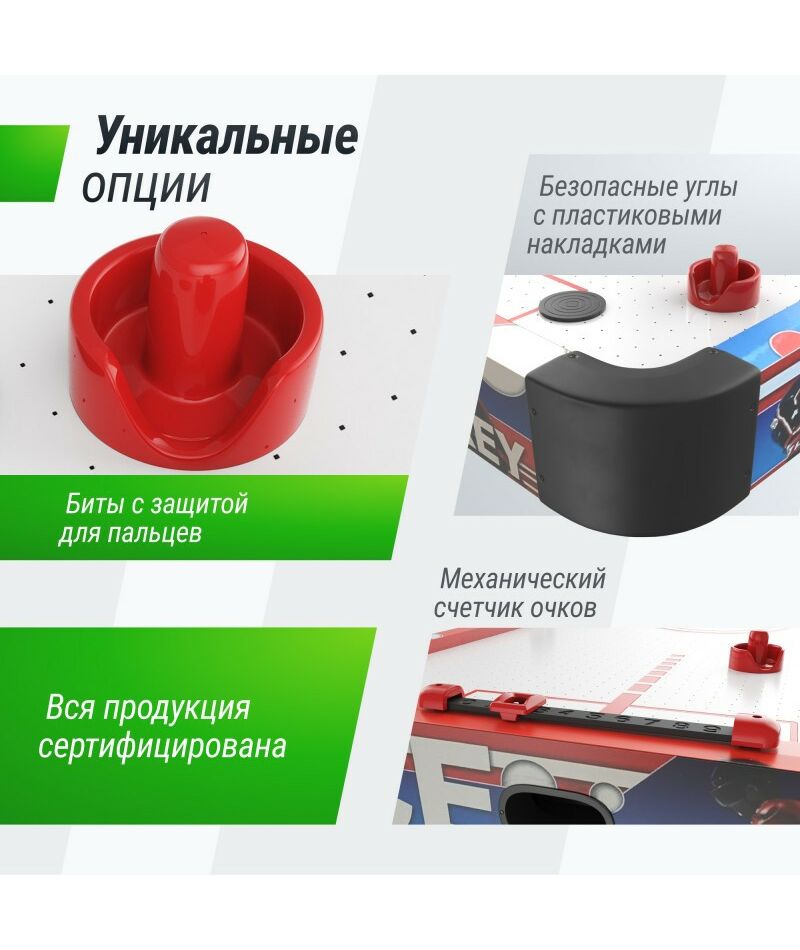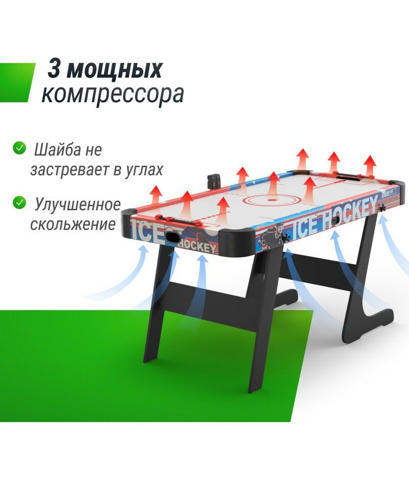 Три мощных вентилятора игровой поверхности обеспечивают плавное и точное движение игровых дисков, добавляя реалистичности и скорости в игру. В комплект входят 2 шайбы и 2 бита из ABS-пластика размером 60 мм. Стол также оснащен электронным счетчиком забитых голов, который работает от 2 батареек ААА (не входят в комплект). Простые правила и легкое освоение делают аэрохоккей привлекательным развлечением для детей и взрослых, стимулируя навыки реакции, координации и стратегического мышления.
