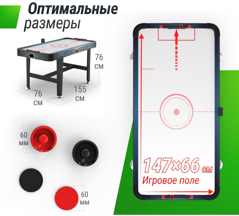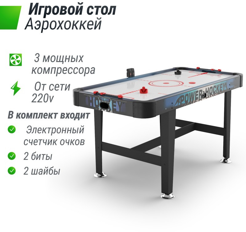 В комплект входят 2 шайбы и 2 биты из ABS-пластика. Размеры шайб и битов составляют 60 мм. Дополнительно, стол оснащен электронным счетчиком забитых голов с работой от 2 батареек ААА (в комплект не входят). Правила игры просты и легко осваиваются, делая этот аэрохоккей доступным как для детей, так и для взрослых.