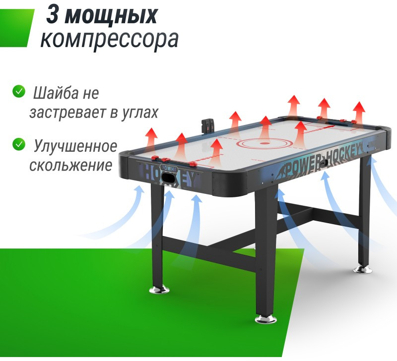 Его стильный и современный дизайн станет привлекательным элементом интерьера вашего дома. Сделанный из высококачественных материалов, он гарантирует долговечность и надежность. Вес стола 22 кг. Благодаря трем мощным вентиляторам, игровая поверхность обеспечивает плавное и безупречное движение игровых дисков, добавляя реалистичности и скорости в игру.