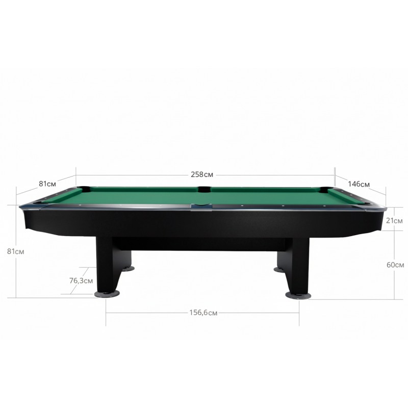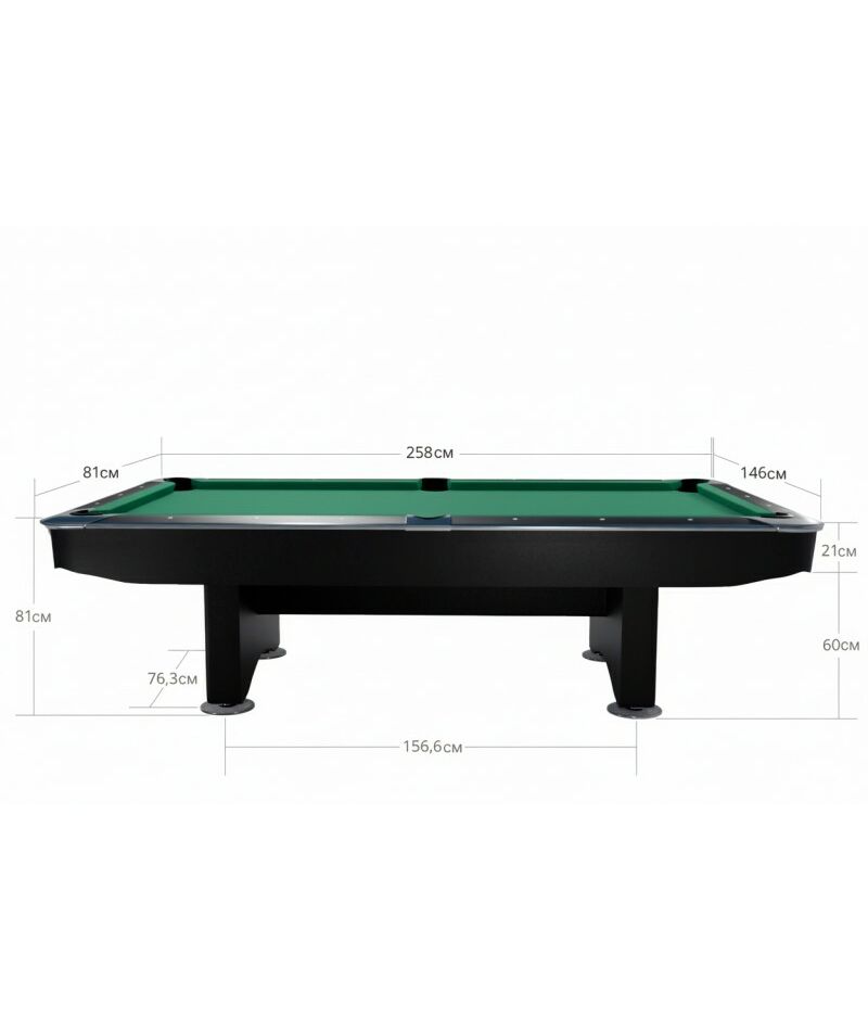 Размеры игрового поля составляют 254 х 127 см, а габаритные размеры стола - 286 х 158 х 81 см. Для комфортной игры рекомендуется минимальное пространство 554 x 427 см.