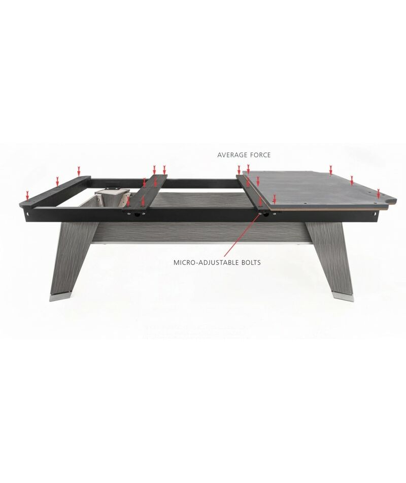 Стол оснащен опорной балкой из стали и дерева. Фирменное выравнивание плиты от Rasson имеет 18 микрорегулируемых точек для идеально ровной игровой поверхности. Удобная и точная система выравнивания плиты обеспечивает превосходную устойчивость.