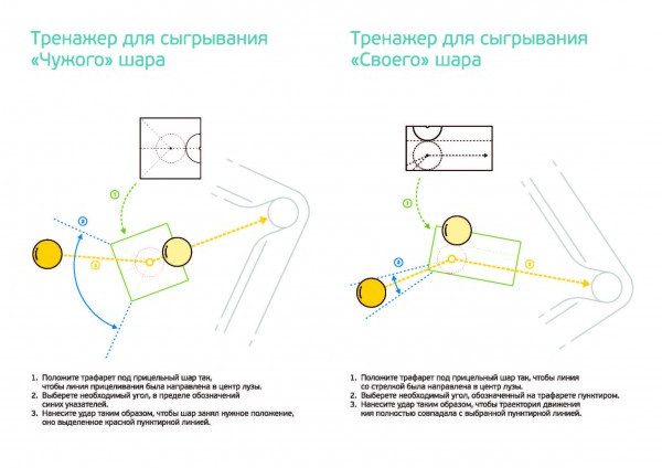 Если вы начинающий игрок в бильярд, то данный комплект тренажеров существенно облегчит вам жизнь. Тренажер наглядно показывает геометрию удара и поможет вам понять, где находится воображаемая точка соударения шаров. Шероховатая внутренняя поверхность трафаретов позволяет надежно держаться на сукне, не меняя положения во время тренировки. Легкий, компактный комплект тренажеров станет неотъемлемой частью ваших тренировок.
