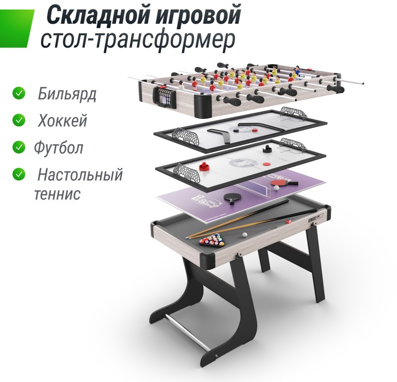 К каждому из 4 полей в комплекте идут необходимые аксессуары для игры, чтобы вы сразу могли насладиться новым универсальным столом трансформером! Складная конструкция игрового стола трансформера позволит перемещать его по комнате или брать с собой на пикник или в поездку. Будьте готовы к бесконечным часам веселья и развлечений!