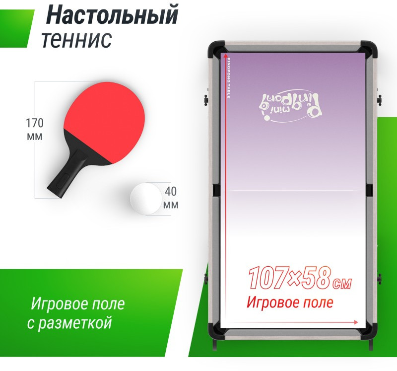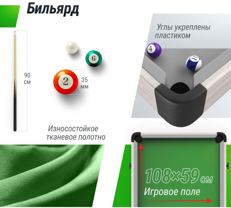 - Аксессуары в комплекте: 2 кия, шары, треугольник, мел, 22 игрока, 2 мяча ? 35мм, 2 биты, 2 шайбы, 2 клюшки, 2 шайбы, 2 ракетки, 2 шарика, сетка