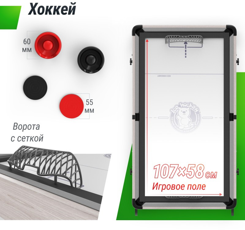 Стол трансформер предлагает вам насладиться игрой в хоккей. Ощутите адреналин и динамичность этих игр, пытаясь забить шайбу в ворота противника. Быстрые движения, точность и реакция - все это станет вашими лучшими помощниками в достижении победы. В комплекте идут 2 биты и 2 шайбы, а также 2 клюшки и 2 шайбы для игры в хоккей.