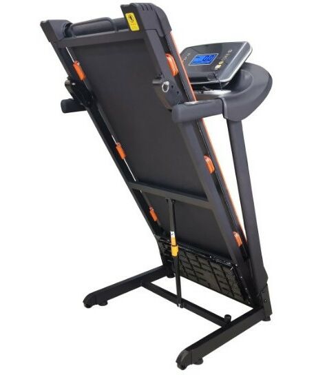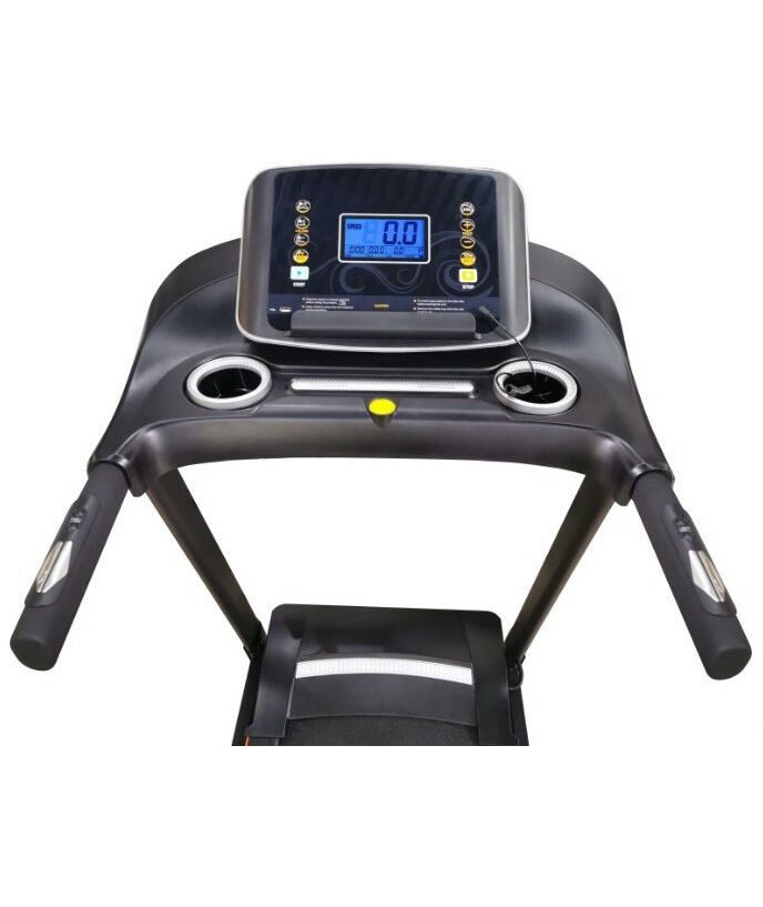 - Консоль оснащена 5″ LCD дисплеем с синей подсветкой, отображающим в реальном времени время, дистанцию, пульс, калории и текущую скорость. 12 программ тренировок помогут подобрать для себя наиболее подходящую. Для удобства пользователей у дорожки предусмотрена подставка под планшет, держатель для бутылки и транспортировочные ролики