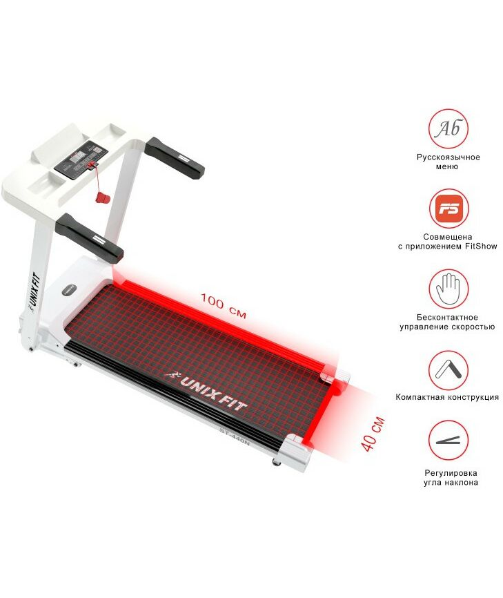 - Беговая дорожка ST-440 оснащена инновационной функцией бесконтактного управления «NO TOUCH CONTROL», которая позволяет регулировать скорость бега с помощью инфракрасного датчика. Теперь, чтобы поменять темп тренировки, достаточно поднести руку к датчику управления и можно будет ускорять или замедлять интенсивность бега! Наличие пульсометра на поручнях поможет следить за сердечным ритмом во время занятий на тренажере.