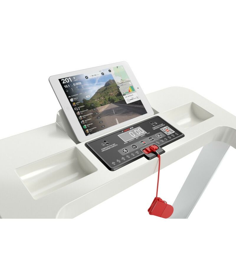 - Наличие удобного держателя под планшет или смартфон позволит пользователю продолжать бегать, не отвлекаясь от своих дел! Любимый трек или фильм внесет разнообразие в монотонный процесс занятий на тренажере.