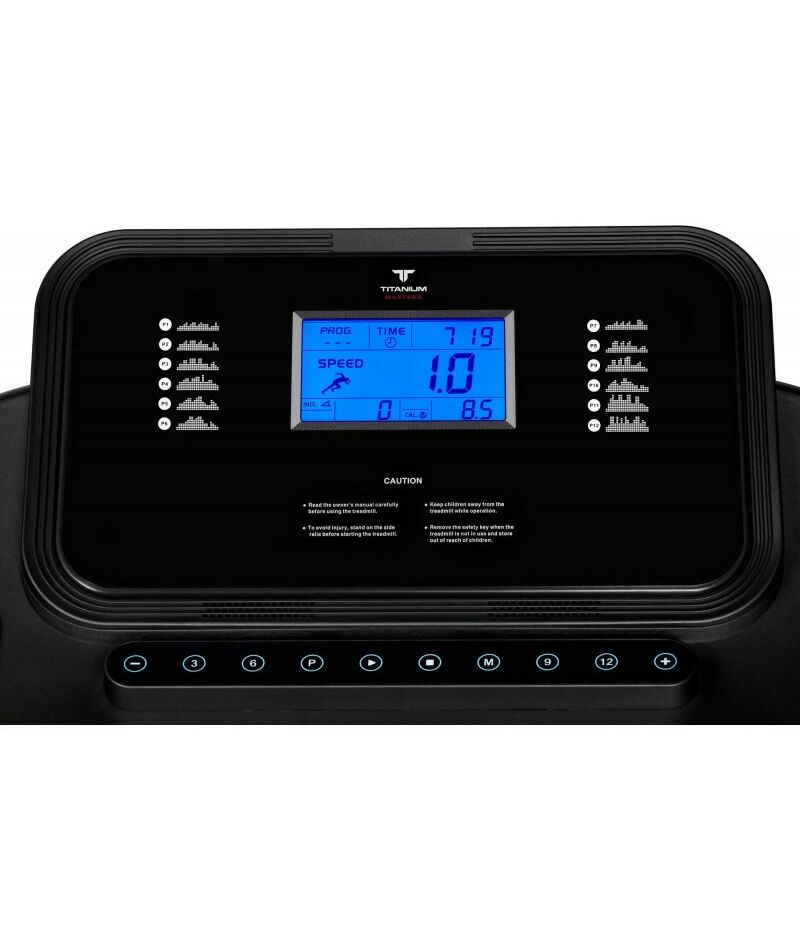 Тренировочный компьютер представлен голубым LCD-дисплеем диагональю 5 дюймов (12,7 см) c сенсорными клавишами. На экран одновременно выводятся все основные параметры тренировки - время, скорость, дистанция, угол наклона, потраченные калории и пульс.