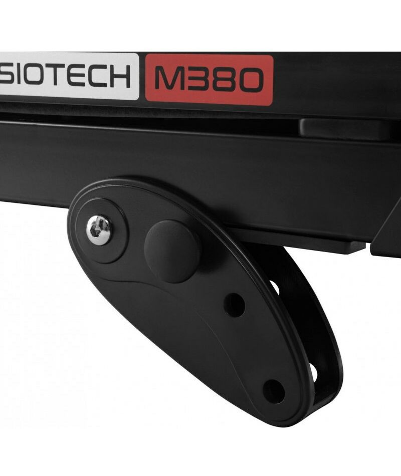 Угол наклона регулируется механически в диапазоне от 0 до 4%. Рама Physiotech M380 построена на перспективной платформе Titanium Compact™ с укороченной базой и вынесением моторного отсека под передний вал беговой дорожки. Длина дорожки в рабочем состоянии при размере беговой зоны 130*47 см составляет всего 144 см, а это существенная экономия места при ее использовании.