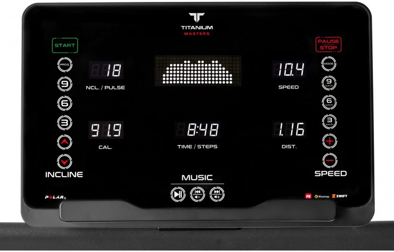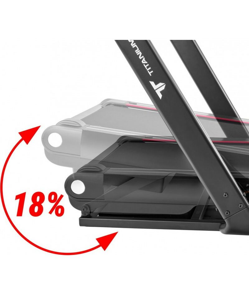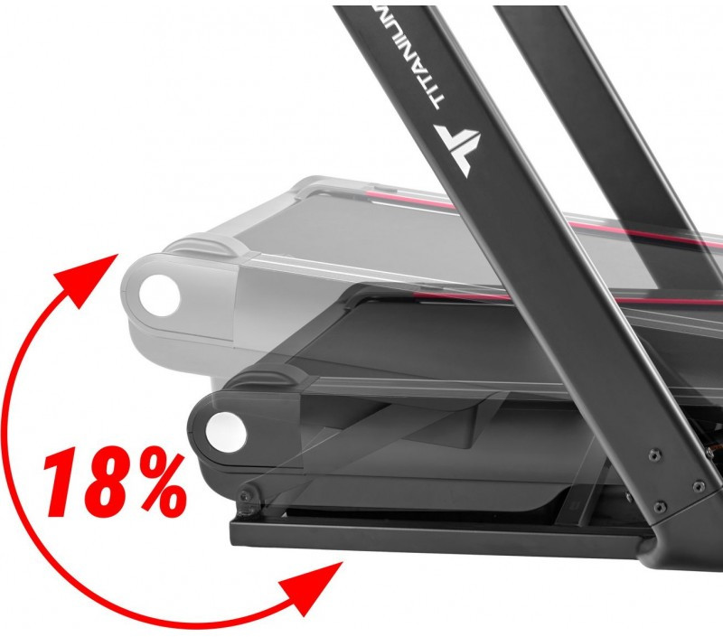 Следствием мощного двигателя является не только большой максимальный вес пользователя, но и максимальная скорость. Для Titanium Masters Physiotech X-Compact она составляет 22 км/ч, что закрывает потребности любых пользователей, включая профессиональных спортсменов. При необходимости можно увеличить нагрузку за счет подключения электрического угла наклона, его диапазон составляет от 0 до 18%.