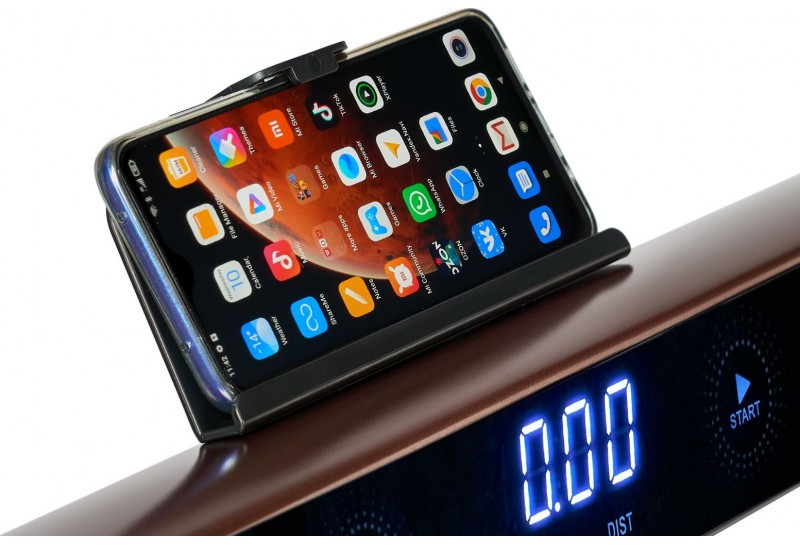 В дорожку установлены колонки мощностью 3 Ватта, подключение мобильного устройства происходит по Bluetooth соединению. Планшет или телефон устанавливается на подставку. К числу передовых решений относится датчик присутствия пользователя. Дорожка остановится и выключится автоматически если тренирующегося нет на беговом полотне.
