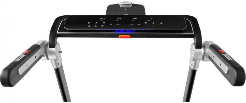 Дорожку можно хранить как в горизонтальном, так и вертикальном положении – для этого предусмотрена опора, надежно фиксирующая тренажер. Преимуществом дорожки является также информативная и технологичная консоль с сенсорными клавишами, построенная с использованием 4-х LED дисплеев последнего поколения. Она обладает простым и понятным интерфейсом – в навигации можно разобраться за пару минут даже без знания английского. Сам компьютер, помимо базовых значений (скорость, дистанция, расстояние, сожжённые калории, угол наклона и пройденные шаги), включает в себя 14 предустановленных программ, каждая из которых специализируется на своей задаче – снижении веса, сжигании жира, развитии выносливости, кардио и т.д.