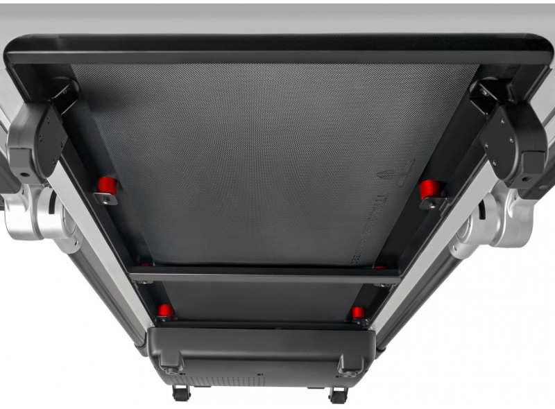 Безусловно, одним из важнейших параметров является качество и размер бегового полотна. Дорожка укомплектована высокопрочным антискользящим полотном с полимерными слоями сложного плетения толщиной 1,8 мм. Размер полотна составляет 123,5 см в длину и 46 см – этого с запасом хватаем для комфортной и безопасной ходьбы или бега на скорости до 16 км/ч. Отдельно стоит сказать про систему складывания. Slimtech S50 складывается за полминуты и транспортируется с помощью транспортировочных роликов в любую точку помещения.