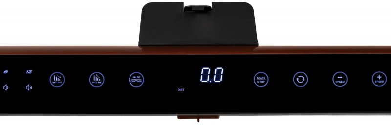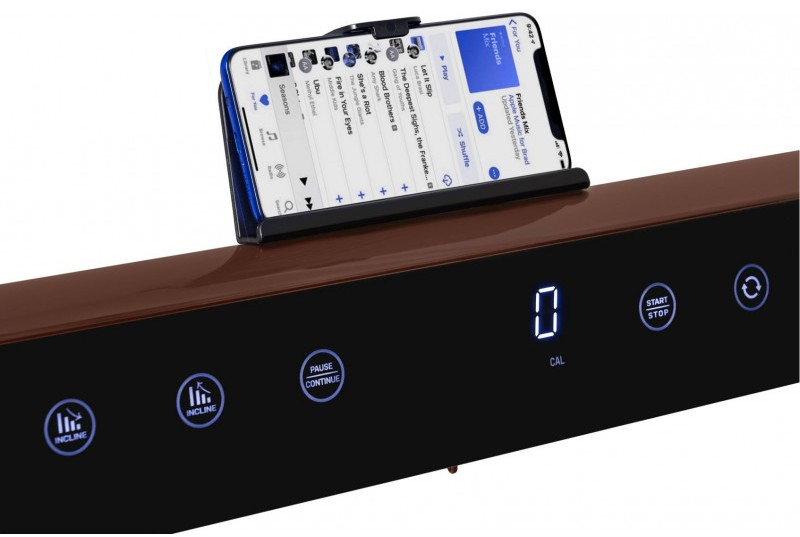 В последнем случае приложение добавляет возможность использования программ обратного отсчета (времени, калорий или дистанции), а также контроль зоны частоты сердечных сокращений. В дорожку установлены колонки мощностью 3 Ватта, подключение мобильного устройства происходит по Bluetooth соединению. Планшет или телефон устанавливается на подставку.