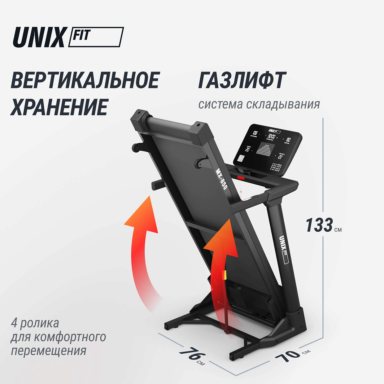 Современная беговая дорожка UNIX Fit MX-850 (версия 2.0) — это современная электрическая беговая дорожка идеально сочетает производительность, удобство эксплуатации и инновационные технологии, делая каждую тренировку эффективной и комфортной. Спортивный кардио тренажер MX-850 имеет стильный дизайн и оптимальные размеры, позволяющие разместить её практически в любом помещении. Складная конструкция с оборудована системой складывания газлифт, что облегчает транспортировку и экономит пространство, а четыре транспортировочных колеса помогут легко перемещать дорожку внутри помещения