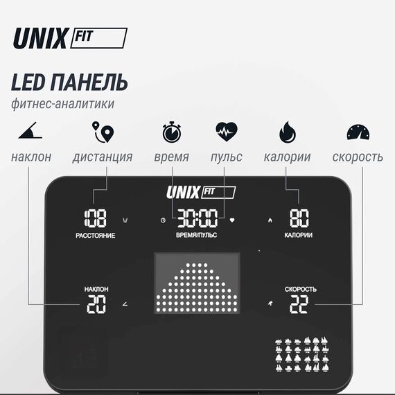 Мониторинг показателей и функциональность Тренажер оснащен интуитивно понятной консолью управления с пятью большими светодиодными дисплеями, которые показывают ключевые данные вашей активности: время, дистанцию, сожженные калории, скорость, пульс, угол наклона и индекс массы тела (ИМТ).