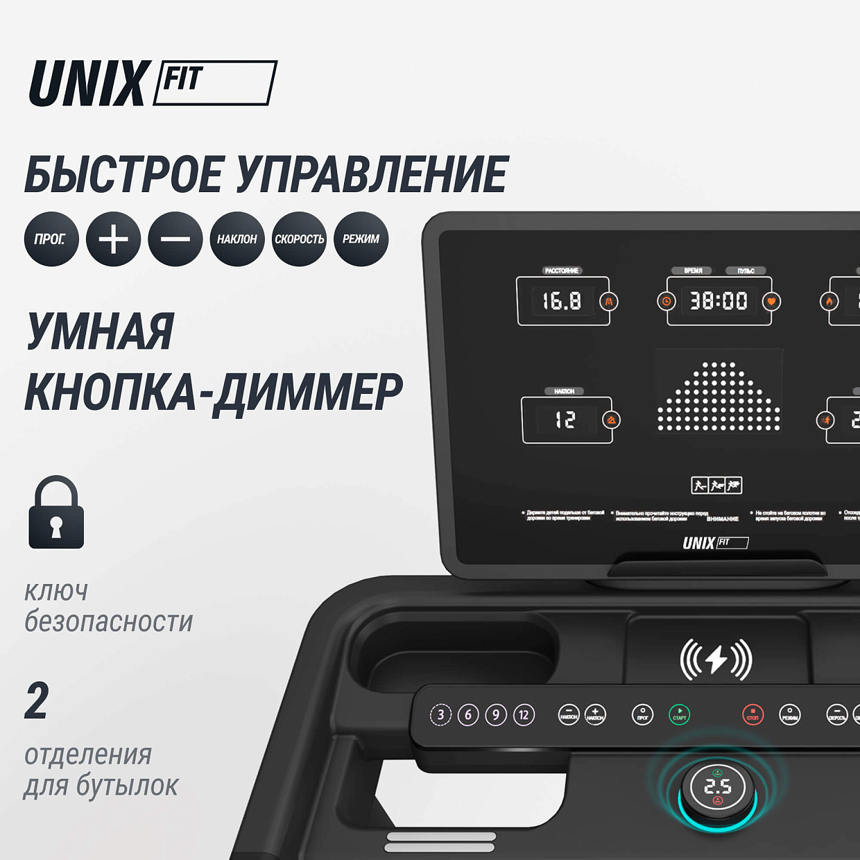 UNIX Fit MX-970 — это инновационная электрическая беговая дорожка премиум-класса с беспроводной зарядкой для дома, созданная специально для тех, кто ценит эффективность тренировок, удобство эксплуатации и современные технологии. Этот тренажёр идеально подойдёт как новичкам, так и опытным спортсменам благодаря своей универсальности и множеству полезных функций.