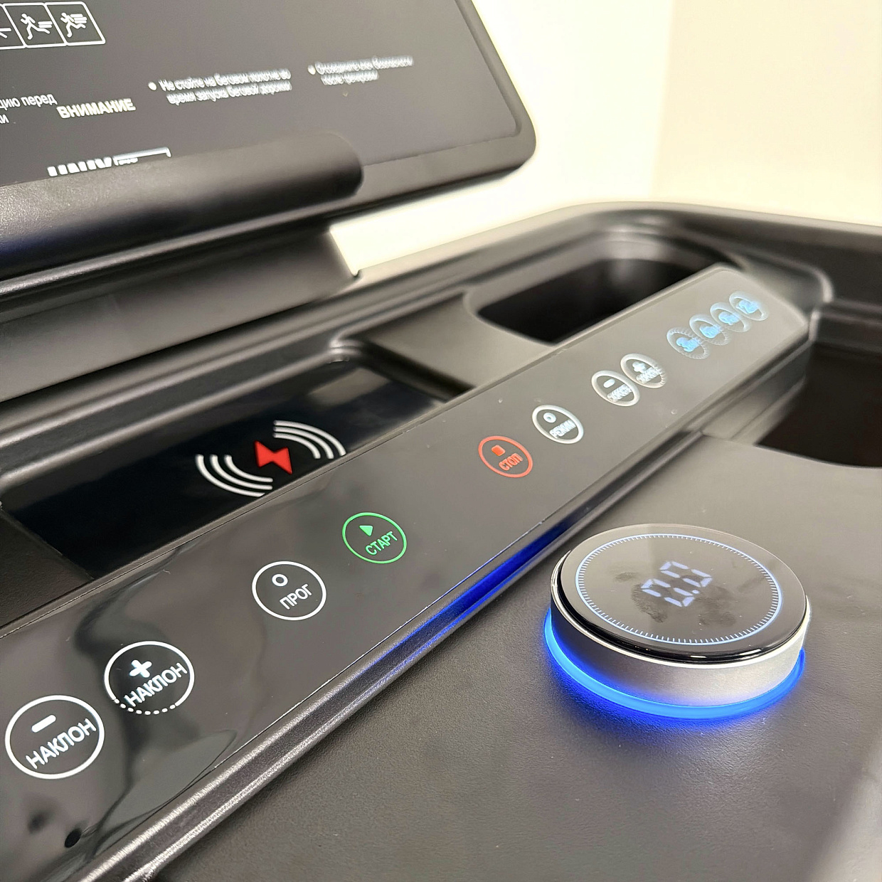 | Особенности | дополнительная консоль с кнопками быстрого выбора скорости, угла наклона, старт/стоп, выбор программ, режимы; умная кнопка-диммер с управлением: включение/выключение, увеличивается/уменьшается скорости и с отображением на дисплее: скорости, времени, расстояния, количество калорий, пульса, беспроводная зарядка для гаджетов |