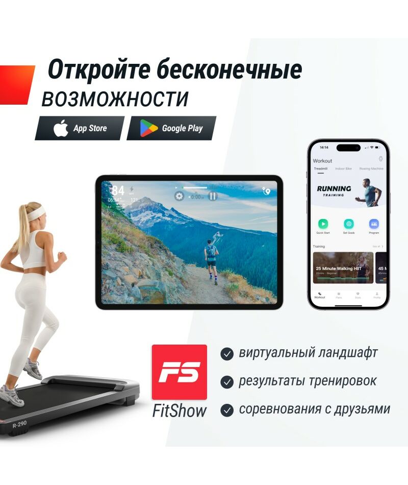 Также, имеется возможность синхронизации беговой дорожки с мобильным устройством при помощи приложений FitShow (подключение через Bluetooth) с возможностью управления беговой дорожкой и сохранения тренировок.