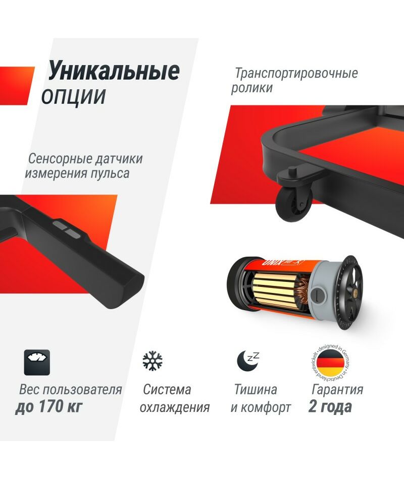 - Измерение пульса: беспроводной нагрудный кардиодатчик UNIXFIT (в комплекте), сенсорные датчики на поручнях