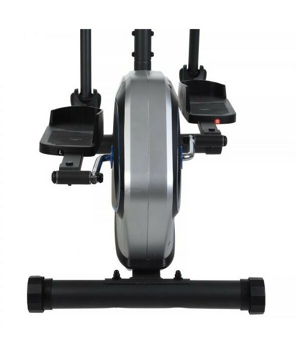 - Встроенный бортовой компьютер с LCD дисплеем позволяет легко настраивать режим тренировки и отслеживать ключевые параметры: затраченное время, дистанцию, скорость движения, расход калорий, обороты в минуту и уровень пульса (сенсорные датчики встроены в поручни). Регулировка нагрузки происходит в 8 положениях.