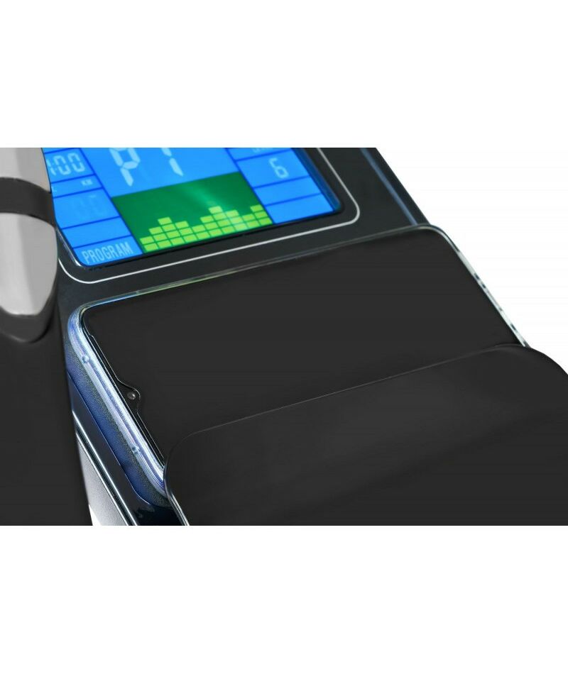 - Показания консоли: программный профиль, уровни нагрузки, время, дистанция, скорость, калории, обороты в мин., пульс, ватты, фитнес-тест (Recovery)
