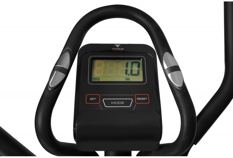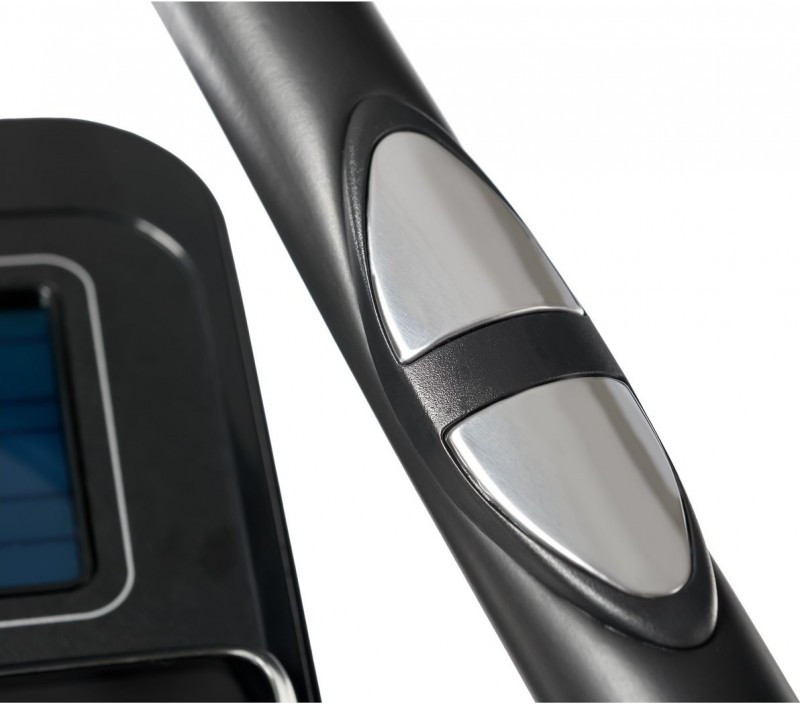Два типа поручней позволяют комфортно тренироваться людям любого роста и комплекции. Рама эллипсоида, выполненная из усиленного стального профиля, в состоянии выдержать пользователя весом до 130 кг. Тренировочный компьютер представлен черно-белым LCD-дисплеем диагональю 5 дюймов (12,7 см). На экран выводятся все основные параметры тренировки - время, дистанция, скорость, калории, обороты в мин. и пульс. Измерение пульса происходит путем удержания ладоней на сенсорных датчиках пульса, расположенных на поручнях.