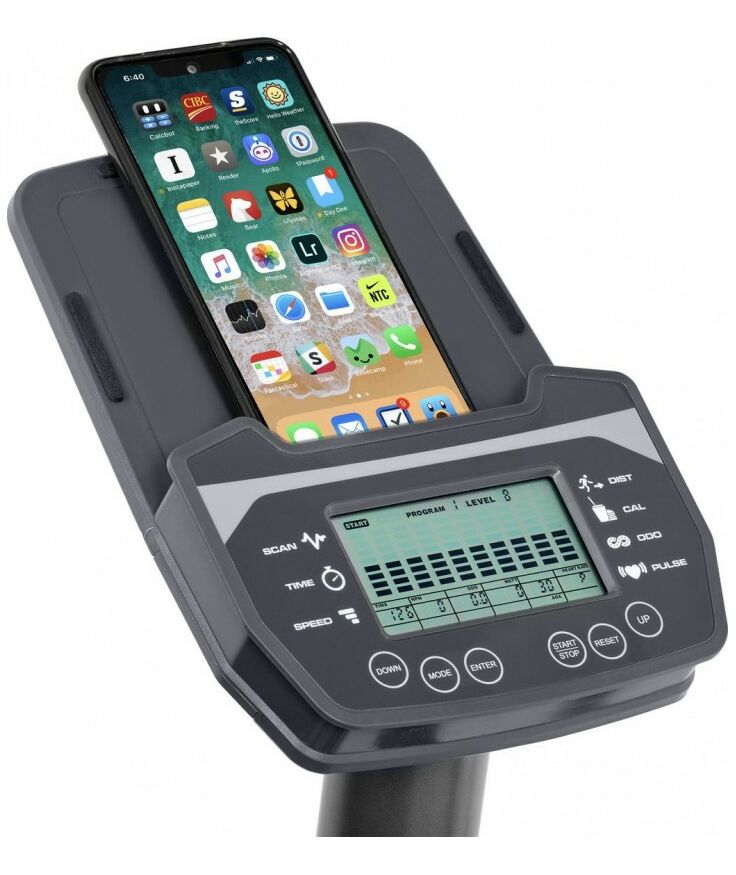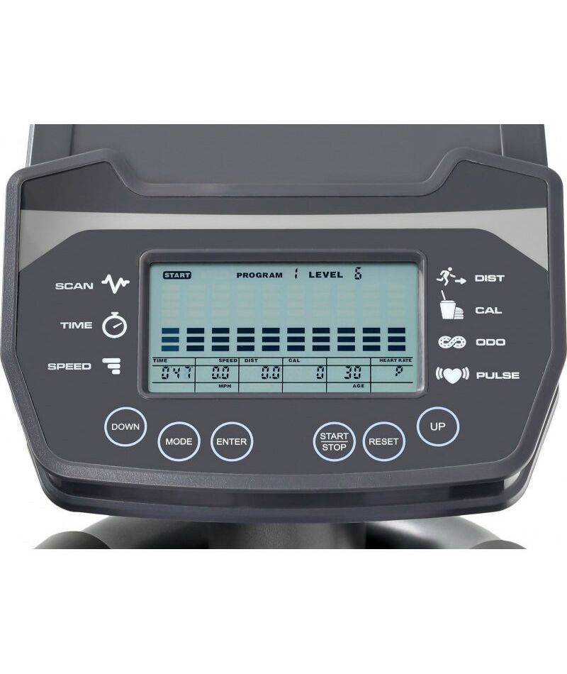 - Показания консоли: программный профиль, уровни нагрузки, время, дистанция, скорость, калории, обороты в мин., пульс, ватты