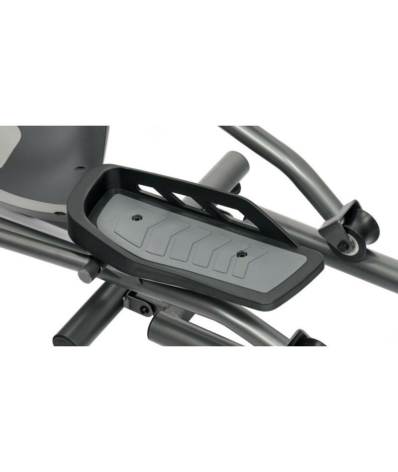 Система компактного складывания true-VERTICAL™ позволяет закрепить рельсовую часть рамы полностью в вертикальном положении. Это существенно экономит место: если в рабочем состоянии длина тренажера составляет 177 см, то в сложенном – всего 79 см (коэффициент складывания 2,24). Тренировочный компьютер представлен черно-белым LCD-дисплеем с удобной подставкой под смартфон или планшет.