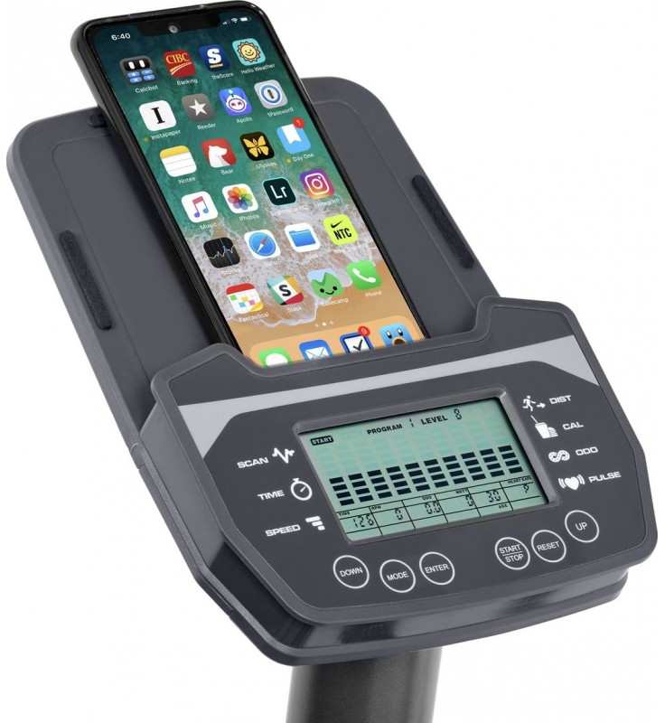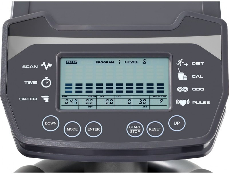- Показания консоли: программный профиль, уровни нагрузки, время, дистанция, скорость, калории, обороты в мин., пульс, ватты