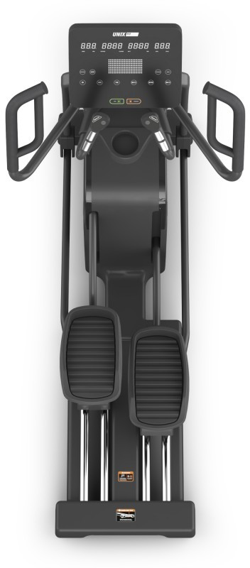 - Переднеприводная система. В эллиптическом тренажере UNIX Fit E-1600 Generate PRO (LED) маховик расположен спереди. Такая конструкция позволяет увеличить максимальную длину шага и обеспечивает естественное перемещение педалей. Благодаря высоко расположенным поручням, устройство подойдет пользователям любого роста.