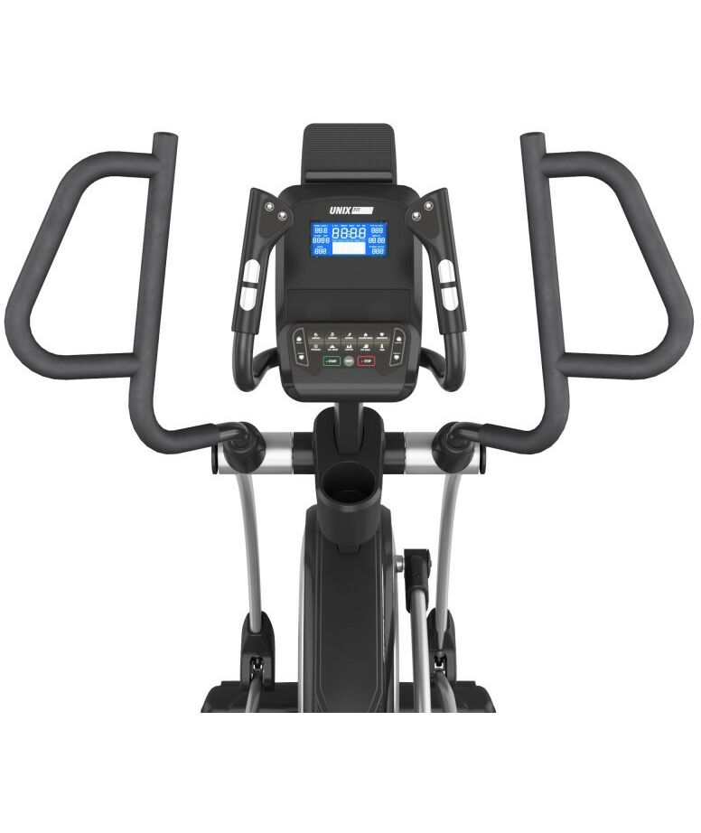- Переднеприводная система. В эллиптическом тренажере UNIX Fit E-950 PRO маховик расположен спереди. Такая конструкция позволяет увеличить максимальную длину шага и обеспечивает естественное перемещение педалей. Благодаря высоко расположенным поручням, устройство подойдет пользователям любого роста.