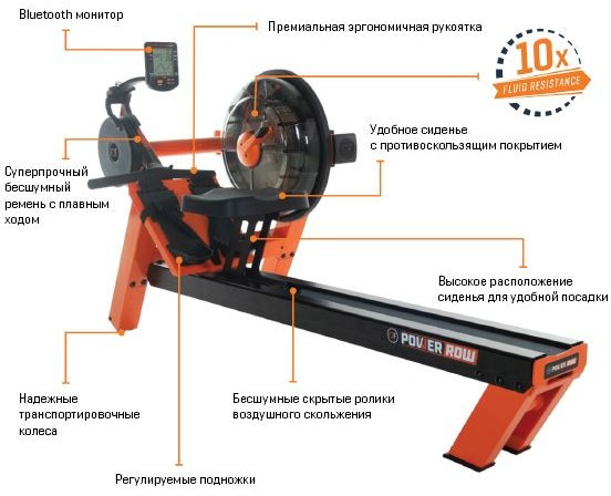 - FluidPowerROW - это профессиональный гребной тренажер премиального уровня, максимально точно имитирующий академическую греблю с реалистичным захватом и постоянным сопротивлением без провалов и мертвых зон от начала до конца гребка. Реалистичность гребли достигается применением запатентованного механизма регулируемого водного сопротивления с двойным резервуаром и 10 уровнями нагрузки
