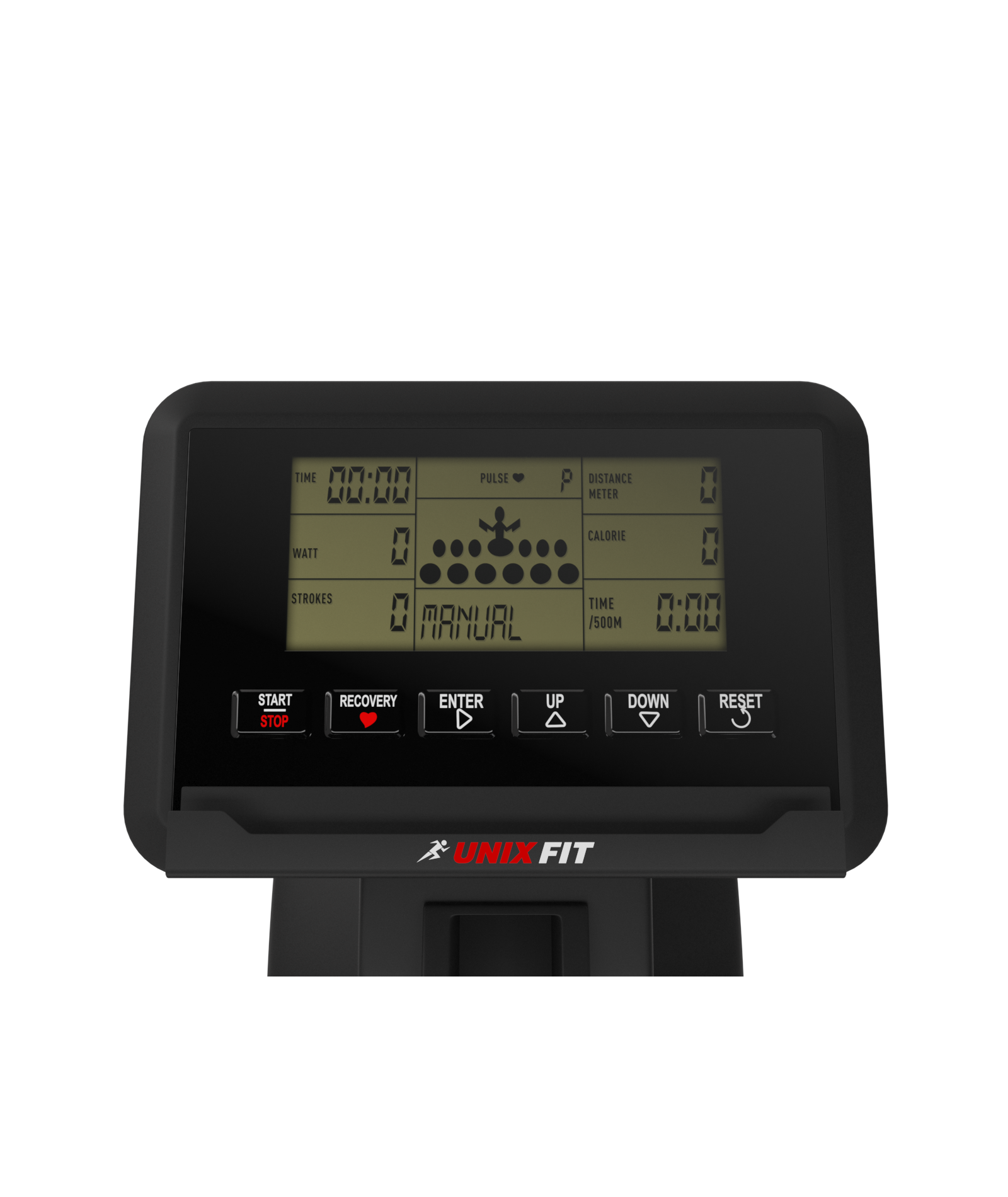 - Показания консоли 5.5” (14 см): время, время/500м, расстояние, калории, текущее и общее число взмахов, среднее количество взмахов в минуту (SPM), пульс, скан, стоп