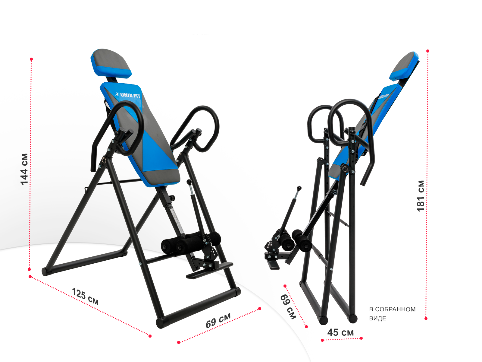 - Компактность – тренажер имеет складную конструкцию. Размеры стола в рабочем состоянии 125 х 69 х 144 см, в размеры в собранном виде 45 х 69 х 181 см.