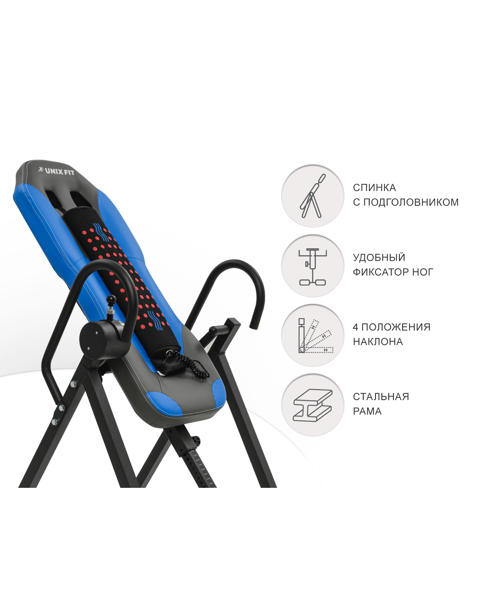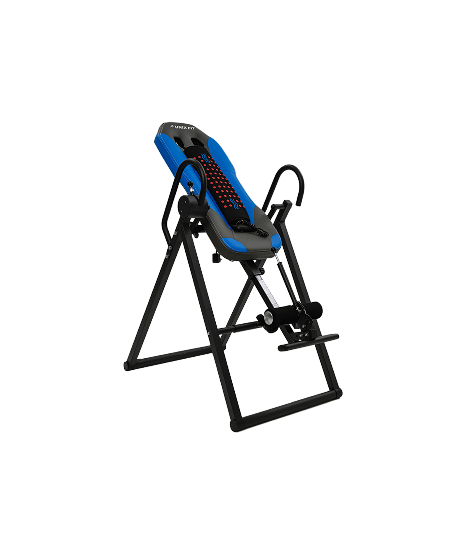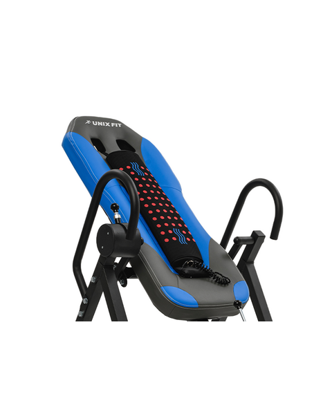 UNIX Fit IV-180M является ПРЕМИУМ моделью среди инверсионных столов. Он оснащен уникальной опцией прогрева и массажа спины. Регулировка осуществляется при помощи пульта дистанционного управления. В комбинации с инверсией, прогрев и массаж значительно усиливают эффект от занятий. При необходимости, массажер можно легко снять с тренажера.