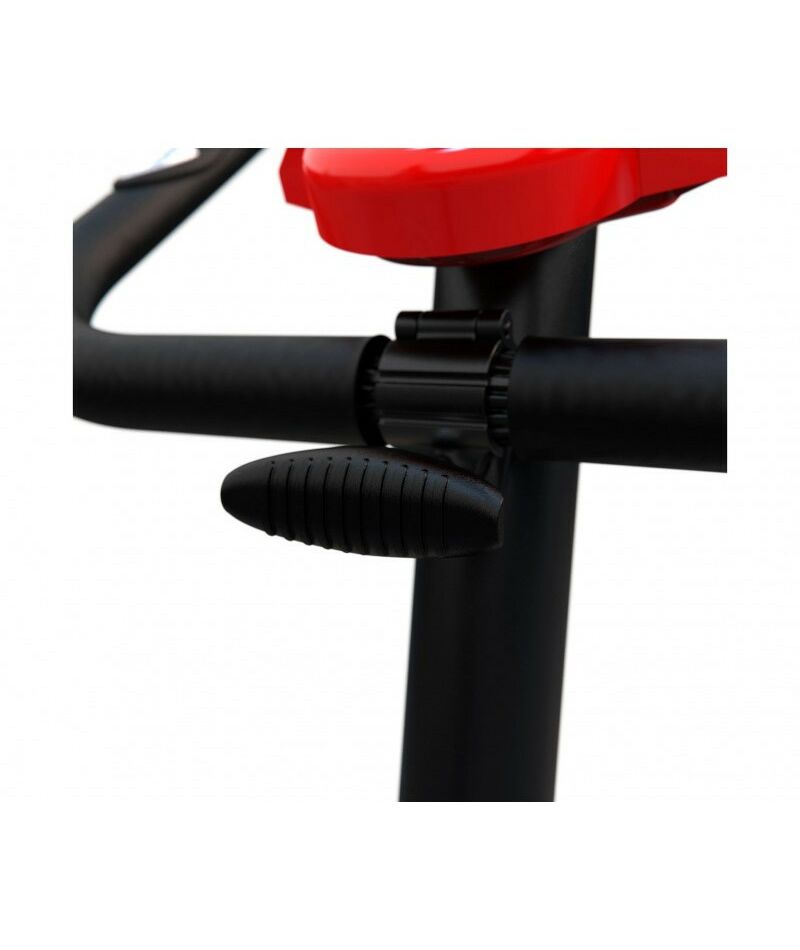 - Дополнительными преимуществами тренажера является наличие компенсаторов неровности пола, что позволяет стабилизировать тренажер на любой поверхности. Регулируемые ремни на педалях обеспечивают удобство и безопасность во время тренировок. Кроме того, велотренажер имеет стильную консоль с монохромным дисплеем и синей подсветкой, которая позволяет отслеживать все показатели тренировки. Дисплей показывает такие