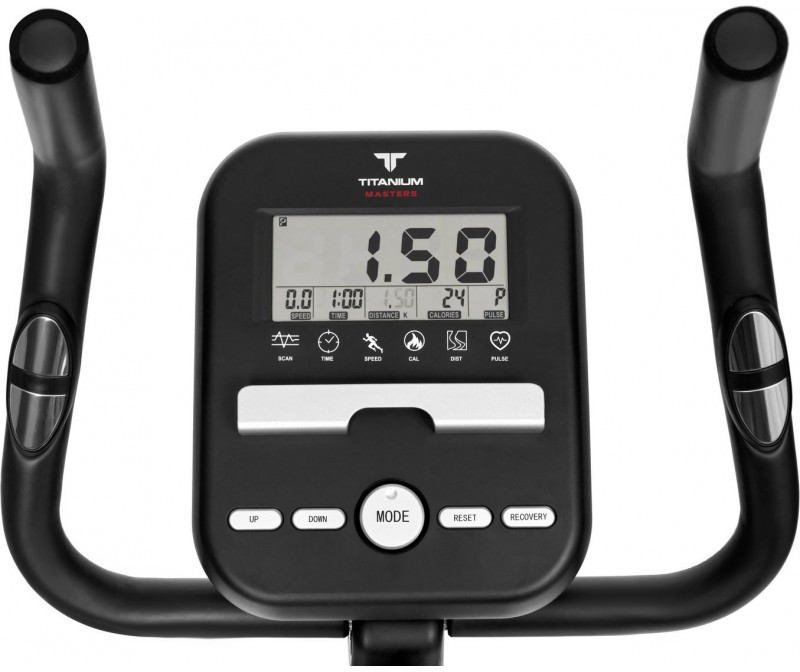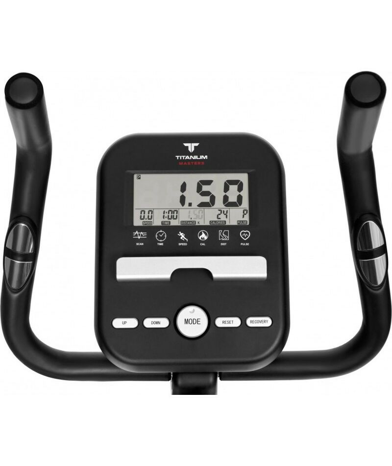 В отличии от большинства других магнитных велотренажеров, тренировочный компьютер Titanium Masters Spintech U20 М представлен большим информативным LCD-дисплеем диагональю 5.5 дюйма (14 см). На экран выводятся все основные параметры тренировки – время, дистанция, калории, скорость и пульс. Основная навигация идет через центральную круглую клавишу управления – за счет ее доступ ко всем функциям максимально просто и понятен. Сенсорные датчики пульса помогут измерить частоту сердечного пульса. Остальные опции также вносят свой вклада в создание общего комфорта. Сидение можно отрегулировать по вертикали и горизонтали (вылет).