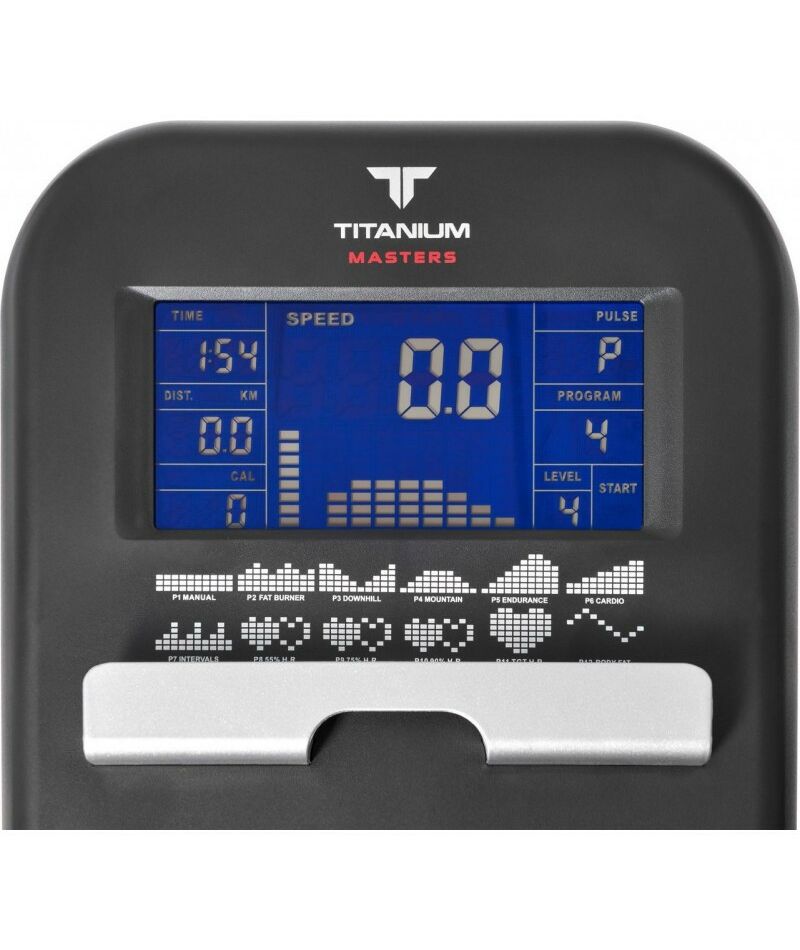 - Показания консоли: программный профиль, уровни нагрузки, время, дистанция, скорость, калории, обороты в мин., пульс, ватты