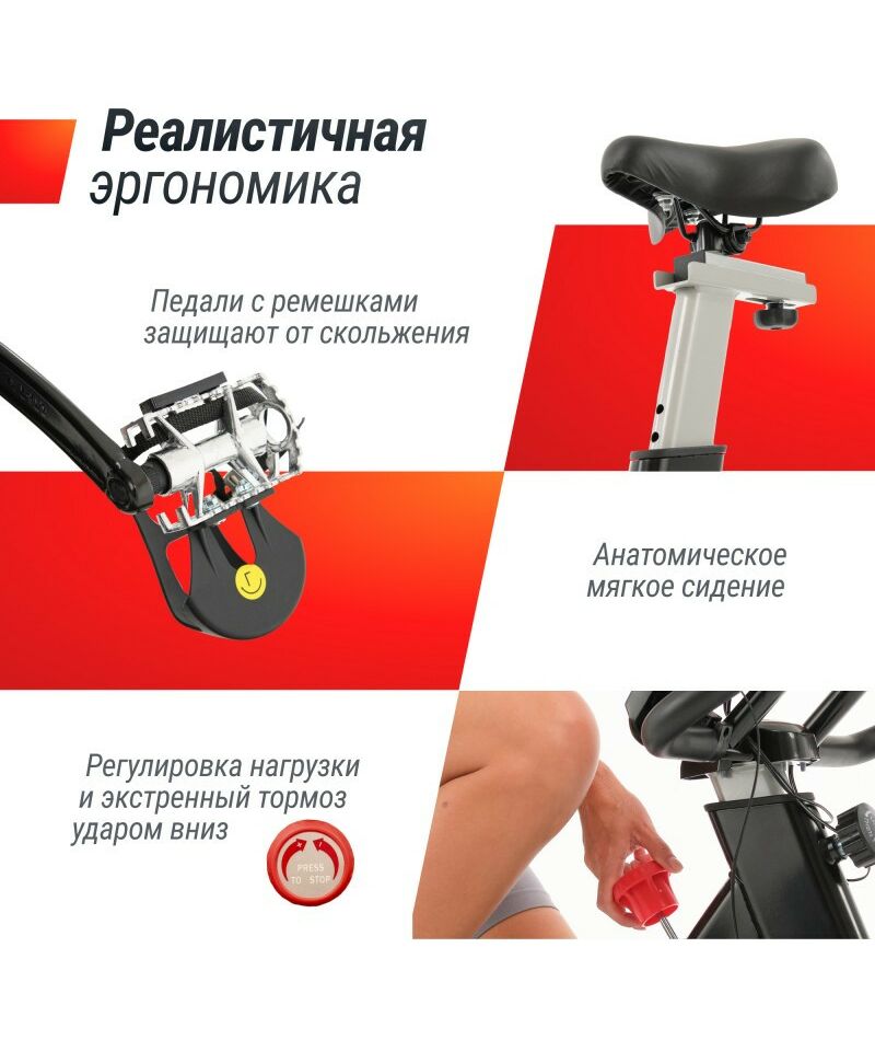Велотренажер для рук и ног не требует подключения к сети и работает автономно. 8 уровней регулировки сиденья по вертикали и горизонтали и 6 уровней регулировки руля по высоте позволяют настроить его под индивидуальные параметры и обеспечить максимальный комфорт во время тренировки. Анатомическое сиденье, педали с ремешками и спортивная бутылочка с держателем обеспечивают дополнительное удобство при длительных кардио тренировках на тренажере. Встроенные компенсаторы неровности пола гарантируют устойчивость во время интенсивного тренинга. Резиновые ножки и защитный коврик в комплекте не позволят испортить напольное покрытие, даже при длительном интенсивном использовании тренажёра на одном месте. Специальные транспортировочные ролики позволят без труда перемещать спин байк по квартире и дому. Колодочная система нагружения, тяжелый маховик 13 кг и бесступенчатая плавная система регулировки обеспечивают максимально плавный ход спинбайка.