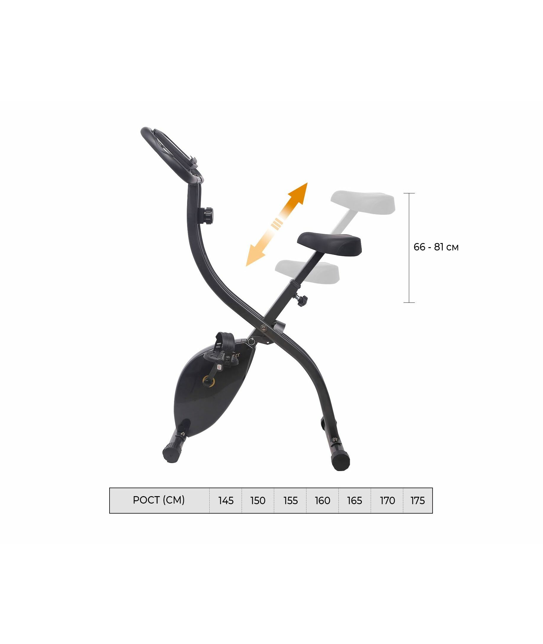 Широкое сиденье регулируется по высоте на 7 уровней в диапазоне от 66 до 81 см. Данное свойство позволяет заниматься пользователям ростом от 145 до 175 см. Максимально доступный вес пользователя - до 110 кг.