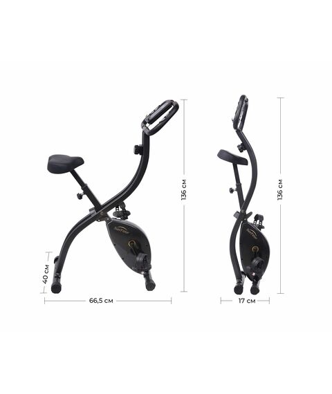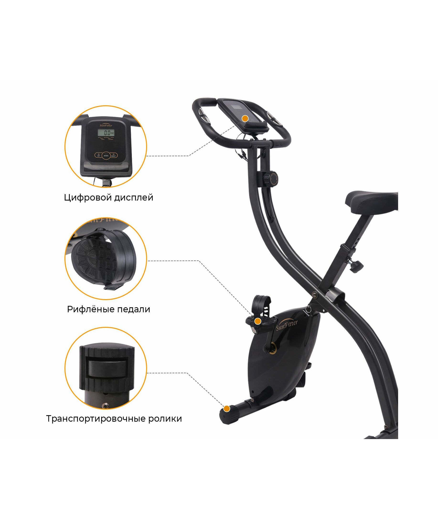 Отличительной чертой SUN FITTER является складная конструкция: в сложенном виде тренажёр занимает всего 17 см по длине. Транспортировочные ролики на передних ножках предусмотрены для лёгкого перемещения по дому. Компенсаторы неровности пола на задних ножках велотренажёра обеспечат комфортные тренировки в любом помещении.