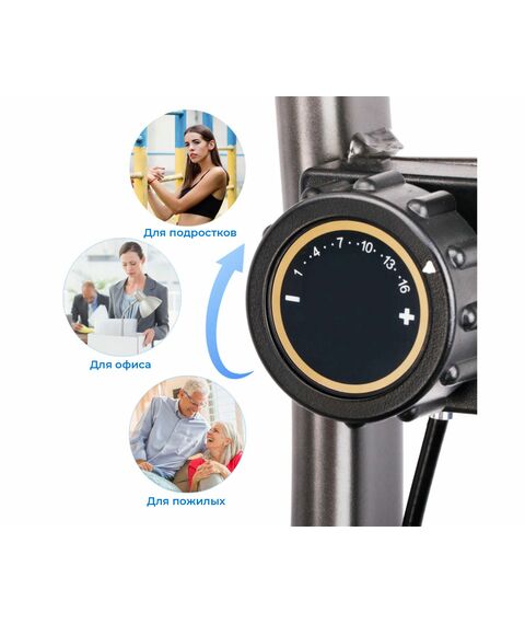 Маховик весом 3 кг создаёт магнитную нагрузку, регулируемую механически с помощью рукоятки на корпусе тренажёра. Всего доступно 16 уровней нагрузки - это довольно обширный диапазон, подходящий под любой тип тренировки.