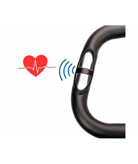 Сенсорные датчики пульса расположены на поручнях. Монохромный дисплей показывает: время, расстояние, скорость, калории и пульс. На консоли расположен держатель для планшета.
