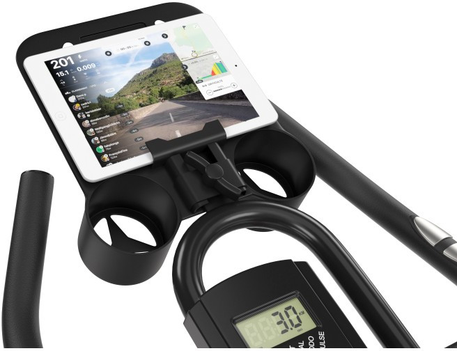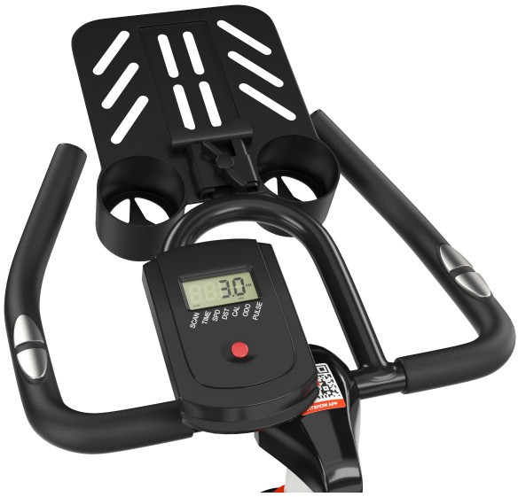 - Спин-байк оснащен консолью с LCD-дисплеем, который отображает показатели времени, дистанции, пульса, калорий и скорости. Таким образом, пользователям будет легко получить максимум эффективности от тренировки. Также поддерживается функция синхронизации тренажера с приложением FitShow: широкий выбор программ и статистика результатов тренировок. В комплекте специальная подставка под планшет или смартфон и пару держателей под бутылочку с водой.