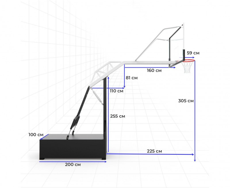 - Размер щита – 180х105 см, высота по кольцу – 305 см, вылет щита – 225 см. В комплекте кольцо диаметром 45 см, крепление. В комплекте кольцо диаметром 45 см и крепление. Квадратный столб из нержавеющей стали толщиной 3 мм, размерами 10 x 20 см, поддерживает щит.