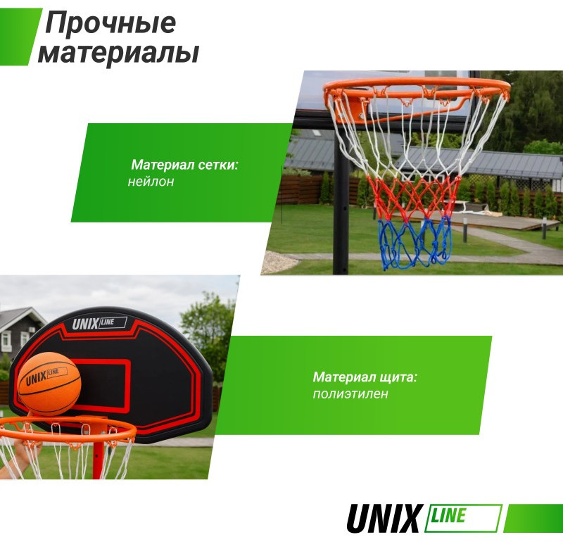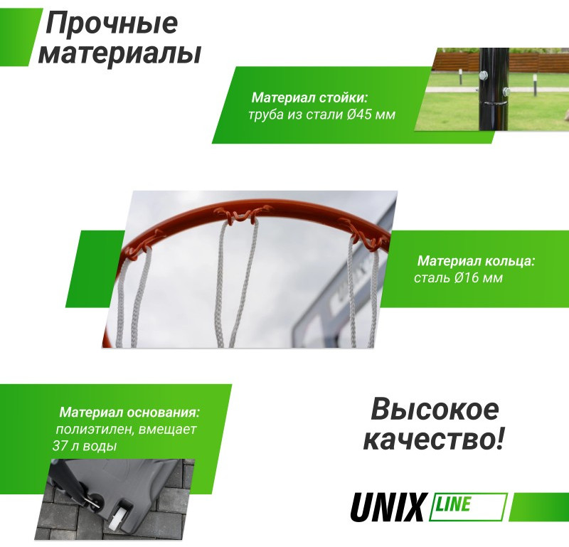 В комплектацию спортивной стойки входят щит и баскетбольное кольцо с сеткой. Благодаря своей мобильности, подобные конструкции устанавливают даже на даче для отработки ударов в одиночку и командной игры. В подарок идет мяч - 5 либо 7 размера в зависимости от модели стойки с насосом – чтобы вы смогли играть уже сразу после сборки. Крайне не рекомендуется выполнять заброс мяча, ухватившись за стойку или за кольцо корзины. Такая манера игры для матчей профессиональной баскетбольной лиги, где устанавливается соответствующее спортивное оборудование. Стойки UNIX не предназначены для таких целей.