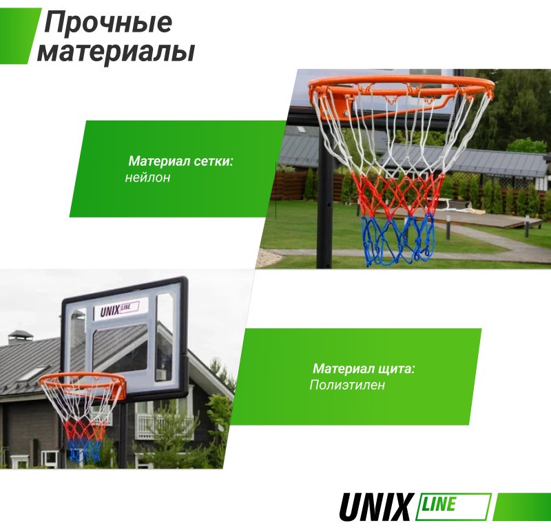 В комплектацию спортивной стойки входят щит и баскетбольное кольцо с сеткой. Благодаря своей мобильности, подобные конструкции устанавливают даже на даче для отработки ударов в одиночку и командной игры. В подарок идет мяч - 5 либо 7 размера в зависимости от модели стойки с насосом – чтобы вы смогли играть уже сразу после сборки. Крайне не рекомендуется выполнять заброс мяча, ухватившись за стойку или за кольцо корзины. Такая манера игры для матчей профессиональной баскетбольной лиги, где устанавливается соответствующее спортивное оборудование. Стойки UNIX не предназначены для таких целей.