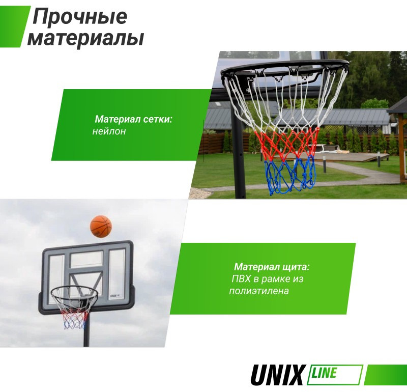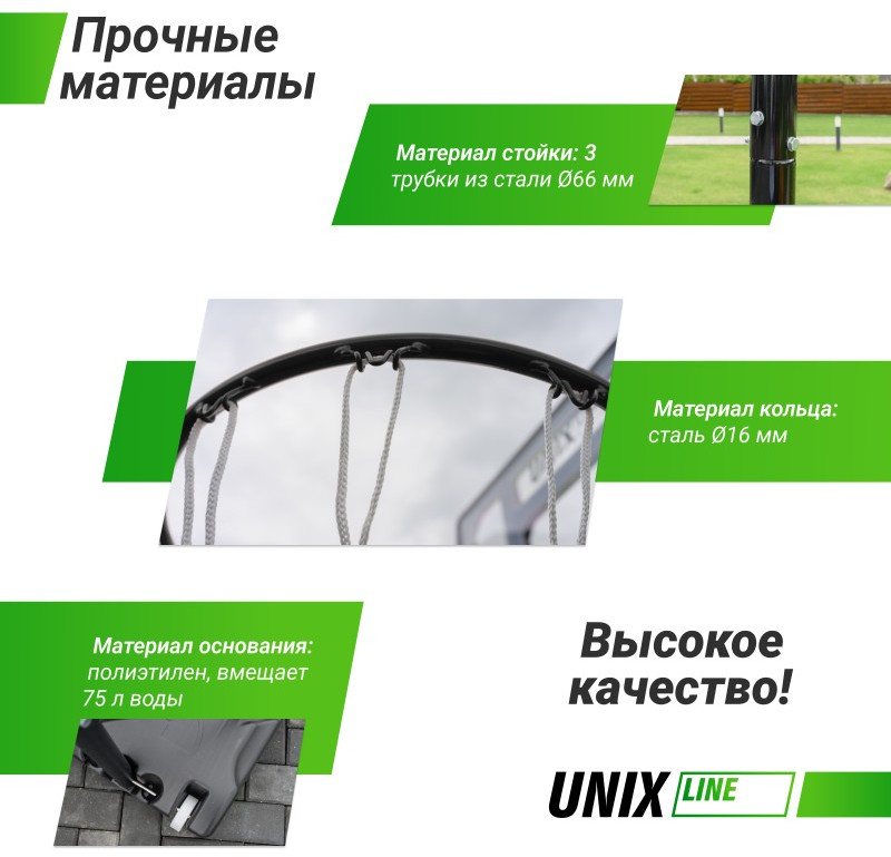 Рекомендуется следить за количеством заполнителя в основании, чтобы сохранять устойчивость в безопасном режиме во время занятий баскетболом. Баскетбольная стойка UNIX UNIX Line B-Stand производится из стали с защитным полимерным покрытием. Собирается как конструктор по частям, которые фиксируются замковым соединением.